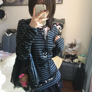 复古辣妹风条纹圆领绑带长袖恤女秋季修身显瘦打底衫上衣