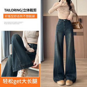 复古蓝阔腿牛仔裤女2025秋季新款高腰宽松显瘦弹力拼接直筒拖地裤