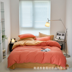 火山秋冬床上用品全棉简约柔软纯色四件套亲肤保暖小磨毛拼色纯棉