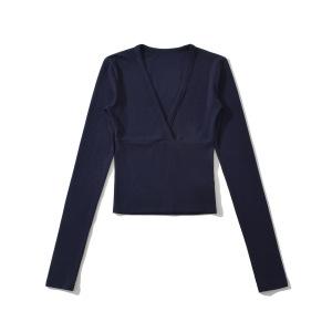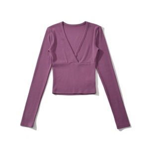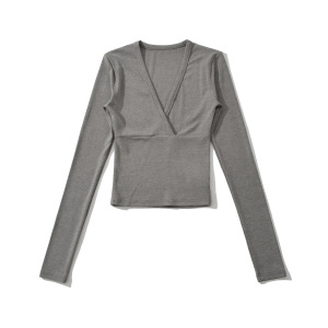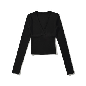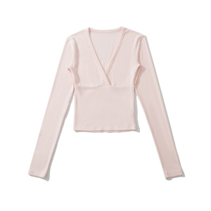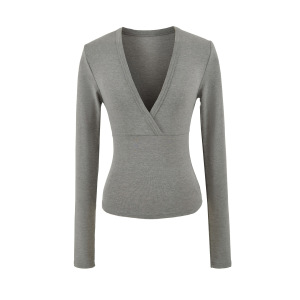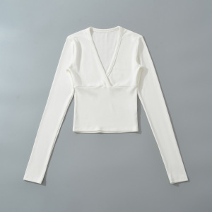 BT928-25秋季新款 欧美风分割线拼接交叉V领长袖短款打底上衣T恤