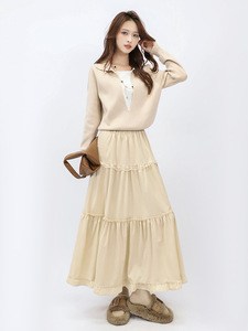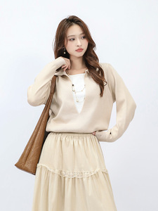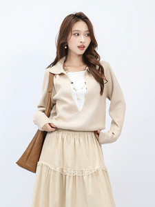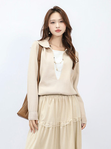 菲媛时尚百搭长袖套头毛衣女 秋冬新款设计感撞色翻领假两件上衣