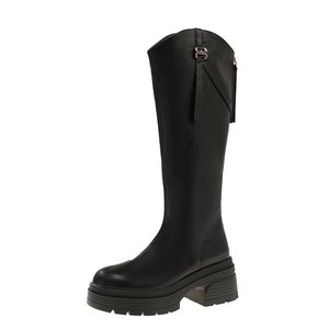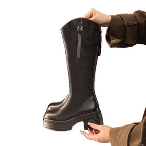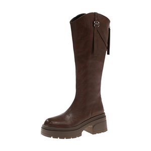 美拉德棕色V口长筒靴女高跟骑士靴复古瘦瘦靴高筒骑士靴粗跟靴子