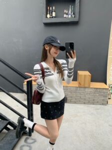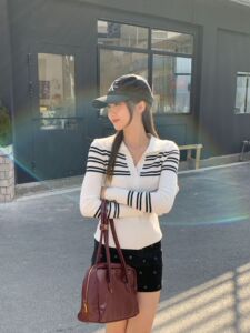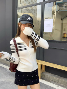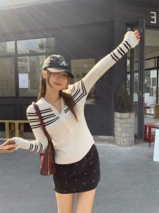 艾蜜朵黑白条纹polo领针织打底衫女修身显瘦软糯气质v领上衣女