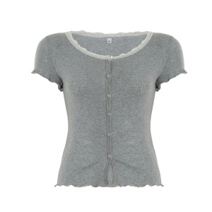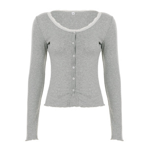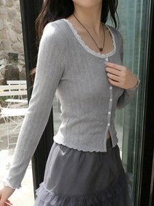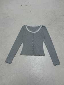 新款甜美清新风圆领蕾丝拼接排扣镂空针织少女修身显瘦长袖上衣