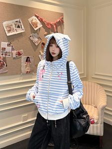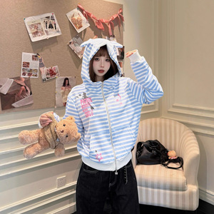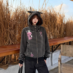 轻亚条纹短款连帽开衫卫衣女2025春秋新款甜辣宽松耳朵设计短外套