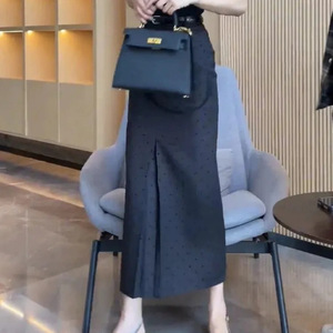 深灰色假口袋设计波点通勤高腰西装裙秋季新款长裙宽松百搭半身裙