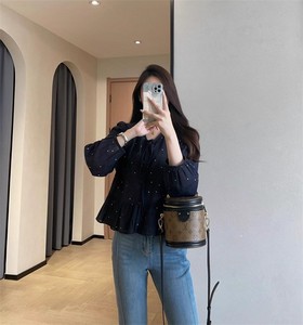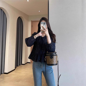 GJ9202减龄俏皮荷叶边拼接下摆亲肤纯棉系带V领波点衬衫女2025秋