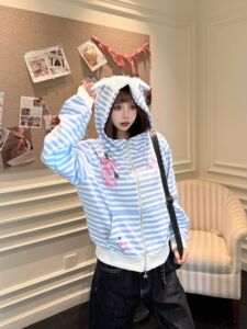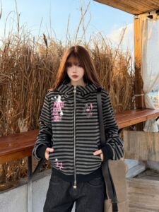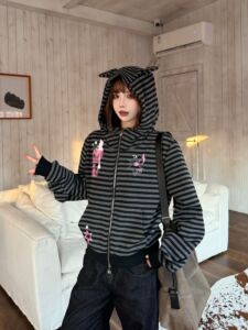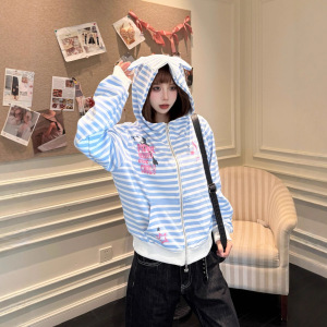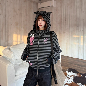 小恶魔连帽卫衣开衫外套女秋季新款比亚风设计感条纹长袖拉链夹克