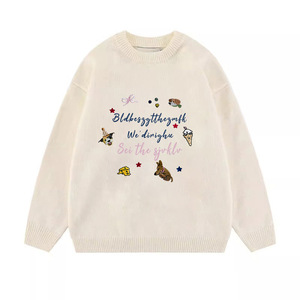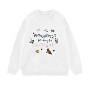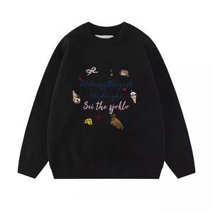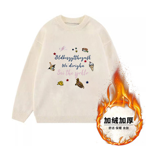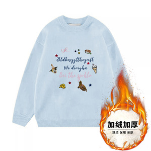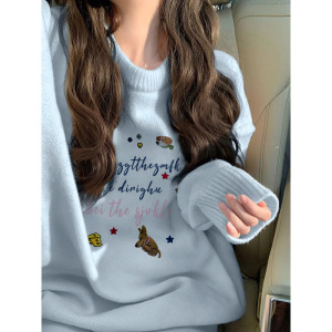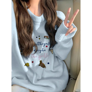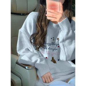 蓝色软糯毛衣女秋冬加绒加厚宽松慵懒风别致设计感套头针织衫上衣