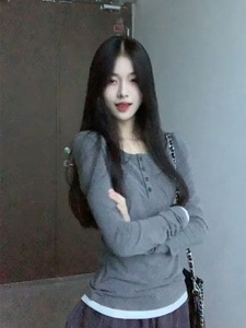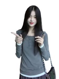 2025新复古甜辣长袖T恤女秋季假两件修身显瘦打底衫洋气减龄上衣