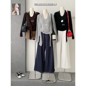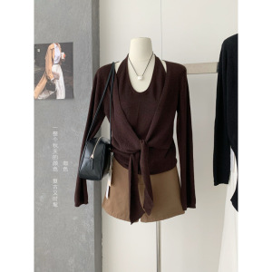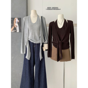 塞纳2025早秋新款法式拼接系带长袖针织衫复古气质假两件挂脖上衣