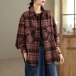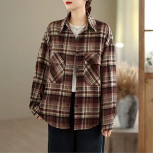 格子衬衫 2025秋季新款 复古双口袋上衣女开衫长袖衬衣外套81626