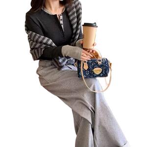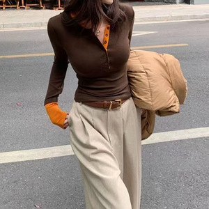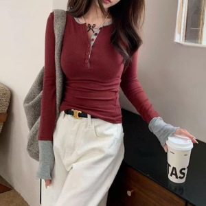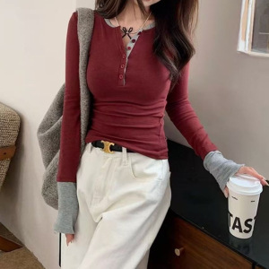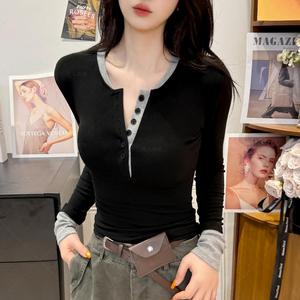 2025秋款撞色假两件别致内搭打底衫女辣妹上衣咖色紫色黑色