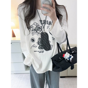 塞纳2025秋季新款重工猫咪慵懒风宽松印花长袖T恤上衣女