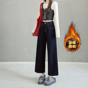 深蓝色阔腿加绒牛仔裤女2025秋冬新款高腰显瘦宽松垂感丹宁拖地裤