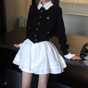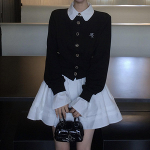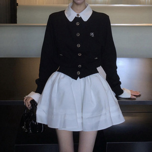 撞色拼接假两件针织开衫毛衣外套边百褶裙套装
