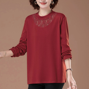 蕾丝拼接镂空半高领长袖t恤女内搭纯棉打底衫洋气大码胖妈妈上衣