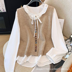 韩系复古假两件彩虹纽扣针织马甲拼接衬衫女秋季新款甜美遮肉上衣