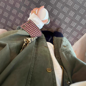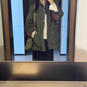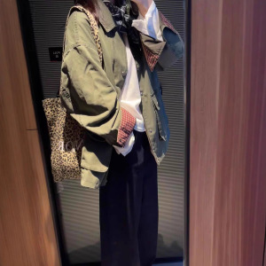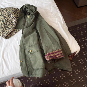 原物推荐!复古军绿色袖口拼格子设计工装牛仔外套女2025秋季新款