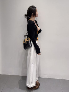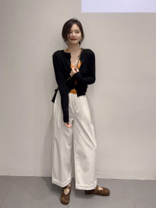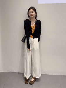 2025秋季新款韩系简约黑色长袖针织衫橘色挂脖背心百搭休闲裤套装