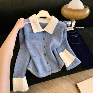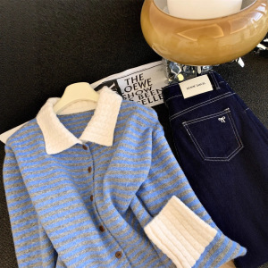 条纹polo领2025早秋季美德拉甜美风翻领设计感针织开衫毛衣外套