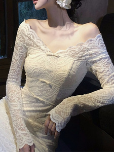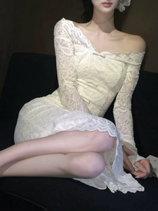 从一时刻媚娘优美一字肩V领长袖连衣裙蕾丝蝴蝶结气质开叉裙