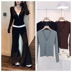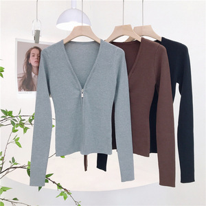 8149 金婧同款上衣秋季深V领纸片人拉链正肩修身显瘦针织长袖外套
