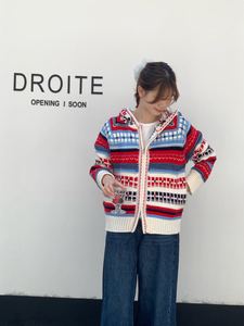 复古民族风费尔岛毛衣外套女韩系秋冬新款宽松百搭连帽针织开衫潮