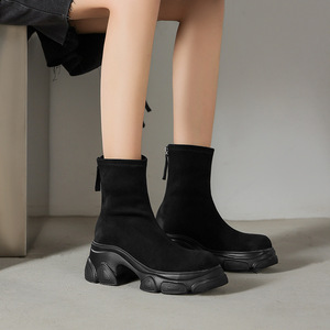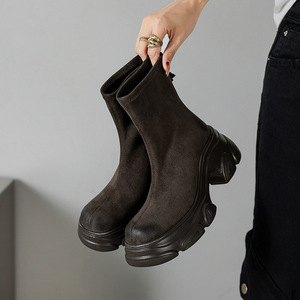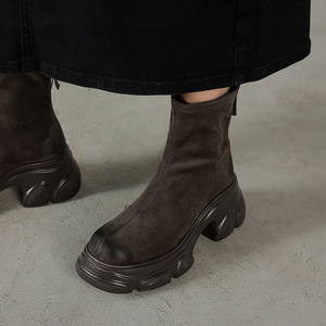 鞋型巨好~胖脚友好~圆头厚底防水台绒面擦色复古做旧瘦瘦弹力短靴