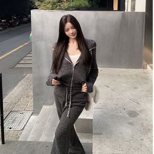 休闲套装复古条纹连帽长袖卫衣外套女冬季穿搭抽绳微喇叭裤两件套