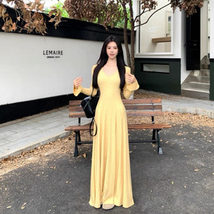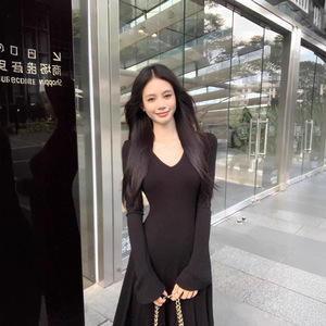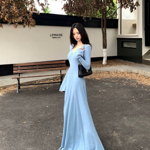 蓝色温柔风气质V领长袖针织连衣裙女秋季收腰修身打底裙垂感长裙