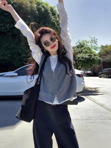 时尚气质百搭套装女2025年秋季新款宽松t恤坎肩马甲阔腿裤三件套