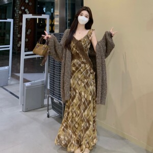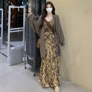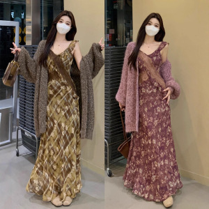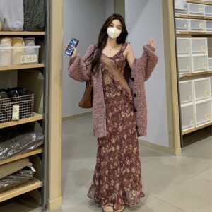 软糯开衫宽松大版毛衣外套温柔气质碎花裙连衣裙女无袖长裙子