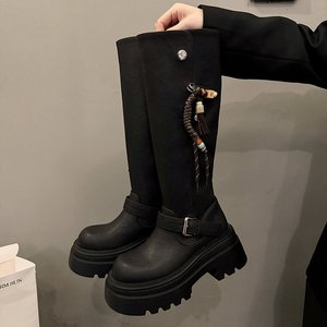 设计感小众厚底长筒靴女2025秋冬新款粗跟百搭显瘦串珠高筒骑士靴