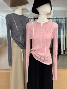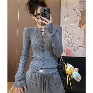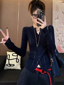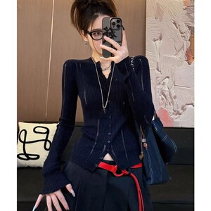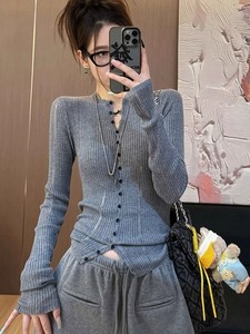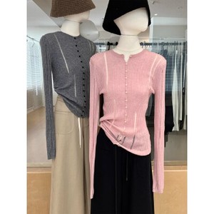 法式灰色镂空针织开衫女早秋季设计感小众修身显瘦内搭打底衫上衣