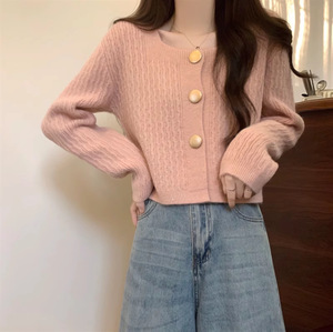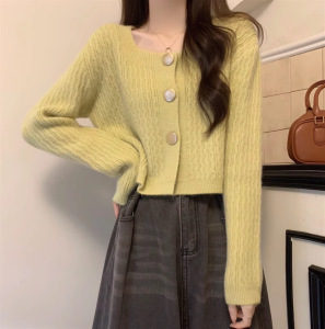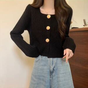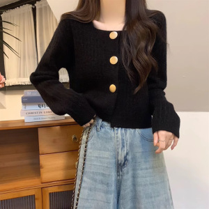 别致独特方领宽松短款毛衣开衫外套女秋2025新款小个子针织上衣