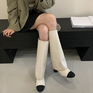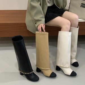 高级小香风杏黑拼接粗跟裤管靴女2025秋季骑士高筒靴子不过膝长靴