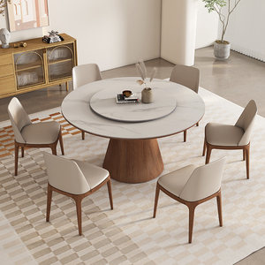 中古侘寂风实木岩板圆形餐桌椅组合简约家用带转盘饭桌子大理石圆