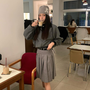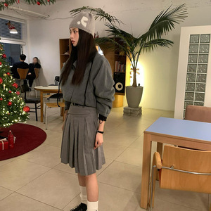 韩国2025秋冬新款立领羊毛拉链夹克外套女中长款百褶半身裙套装女