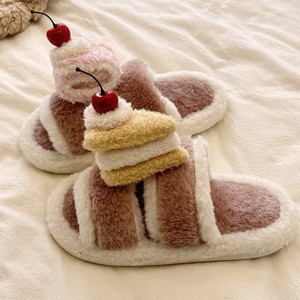可爱樱桃蛋糕毛毛拖鞋女2025秋冬新款外穿保暖软底百搭一字棉拖鞋
