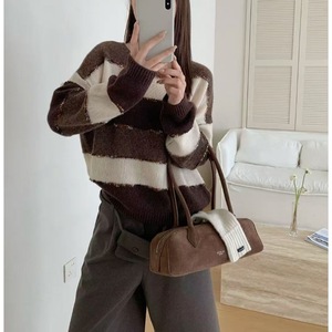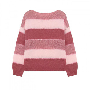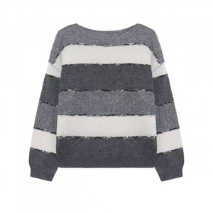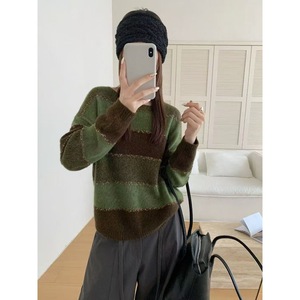 秋季圆领长袖针织衫女套头毛衣上衣拼色条纹时尚百搭驼羊绒宽条纹