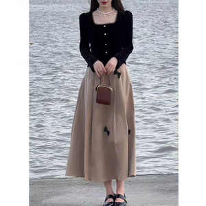 【榛果拿铁】法式复古小香风丝绒蕾丝上衣半裙2025秋款气质两件套