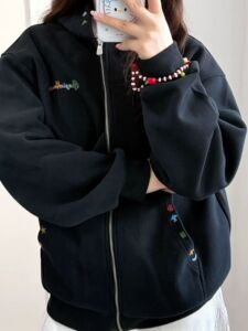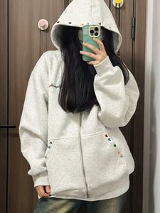 加绒美式复古彩刺绣连帽卫衣外套女秋冬宽松休闲开衫长袖上衣情侣