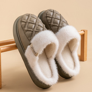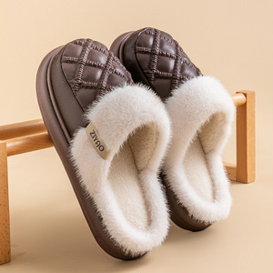 pu皮革防水棉拖鞋女秋冬季居家防滑厚底加绒保暖情侣静音毛绒拖鞋