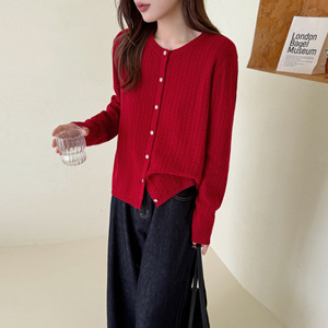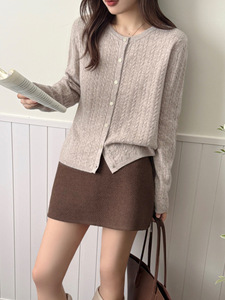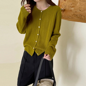 秋冬100纯羊毛开衫女圆领扭花抽条长袖保暖宽松外套毛衣针织上衣