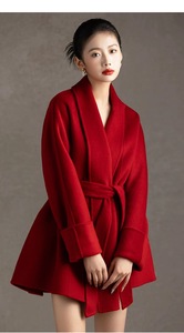 10羊绒小个子赫本风新年红双面呢大衣女短款斗篷系带加厚毛呢外套
