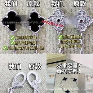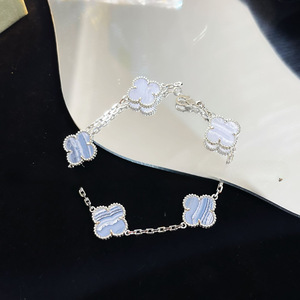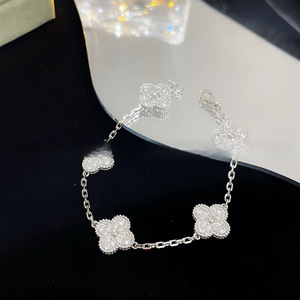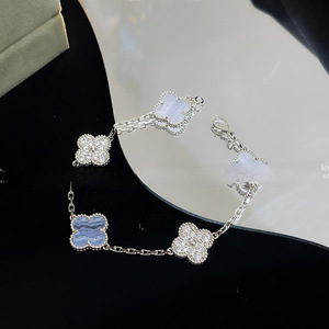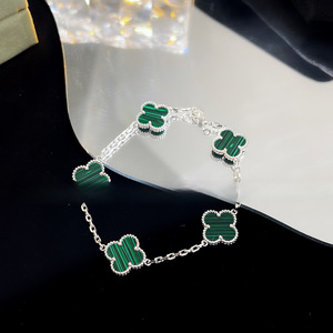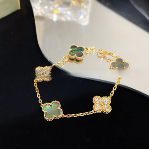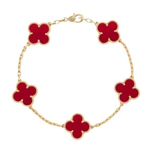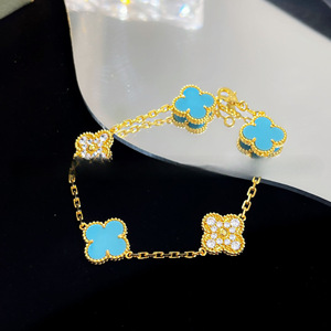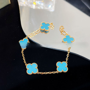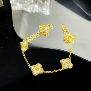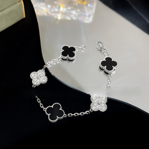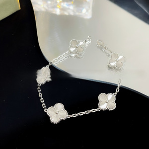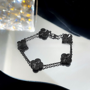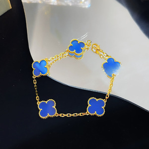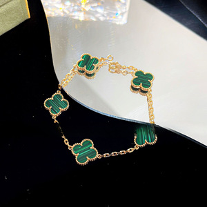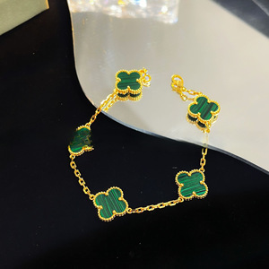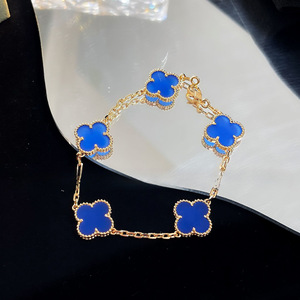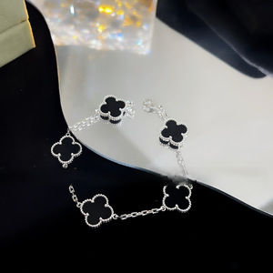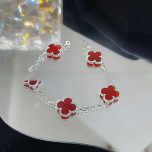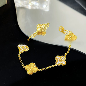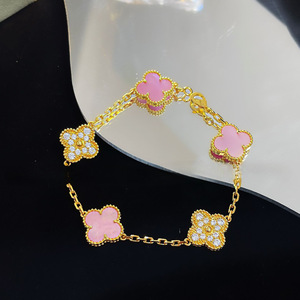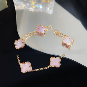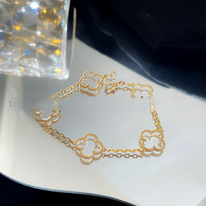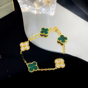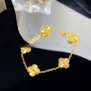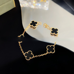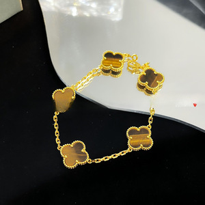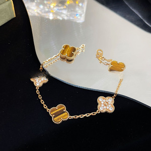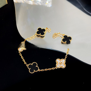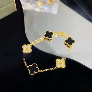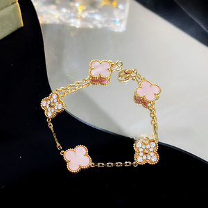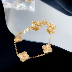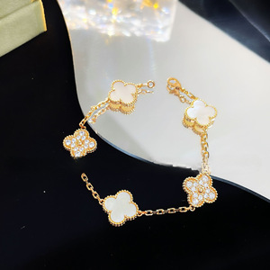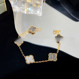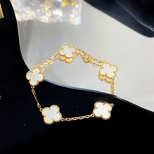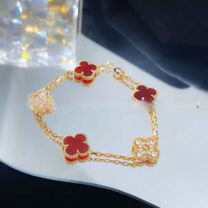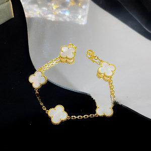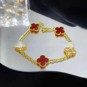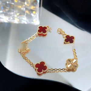 高版本V金四叶草五花白贝母手链高版女厚镀18k红玉髓间熊猫手链