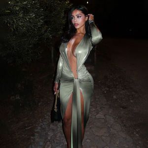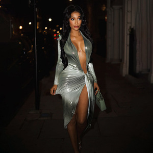 J25DS300 欧美女装秋季新款休闲优雅印花深V长袖飘带褶皱长连衣裙