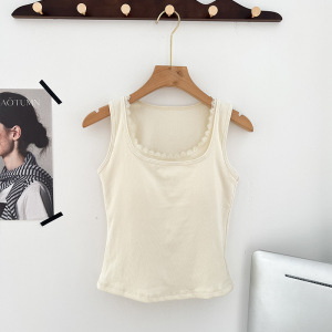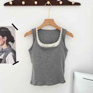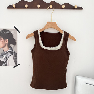 秋冬新款假两件蕾丝边磨毛保暖背心女带胸垫内搭外穿无袖保暖上衣