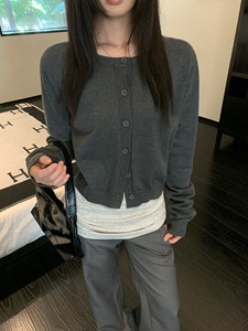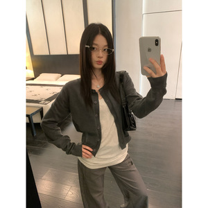 宋正恩深灰色短款针织开衫外套女秋季2025年韩系早秋穿搭长袖上衣